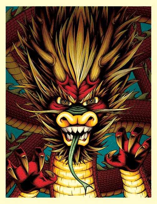 Not a whole lot was changed from the original drawing. The overall hue was added, and the background was darkened to give a greater sense of depth to the image. It may not sound like a lot of work, but clipping out the entire outline of the dragon’s head and claws was quite a meticulous task.