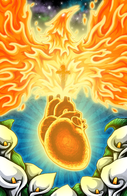 This commissioned piece was intended to be a sleeve tattoo and include multiple elements that the client liked – including a sacred heart that was out of the ordinary. I decided to go with an anatomical heart (which I always liked because of its complex form), which was all too easy to pair with a phoenix.